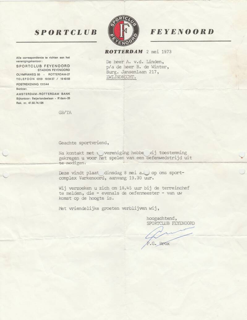 De oud vv Zwijndrecht leden die Ad gekend hebben, weten dat hij een veelzijdig talent was. Hij kon op meerdere posities dan ook uitstekend uit de voeten. Dan hebben we het over de rechtsback- rechtshalf of desnoods in de spits. Dat was bv Feijenoord en Sparta ook opgevallen en informeerden, zoals uit onderstaande correspondentie blijkt, naar zijn gunsten.