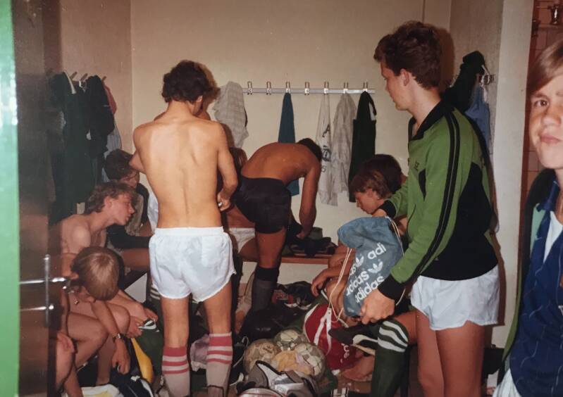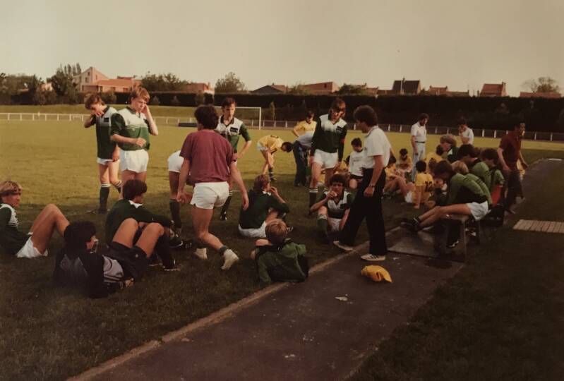 Mei 1985, toernooi Frankrijk bij AS Guesnain. Trainer Jan Mastenbroek zet de zaak in de rust op scherp. Vlnr: Eric Vlieg, André Baijens, Gerrie Roos, Peter Boudewijn, Dick Kreukniet (nummer 4), Cees van Welie, André Hendriks, Carlo Peverelli, John Hopstaken, Marco Plomp (9), Jan Mastenbroek, Martin Guit, Henk van Lith, Robert Nicodem.