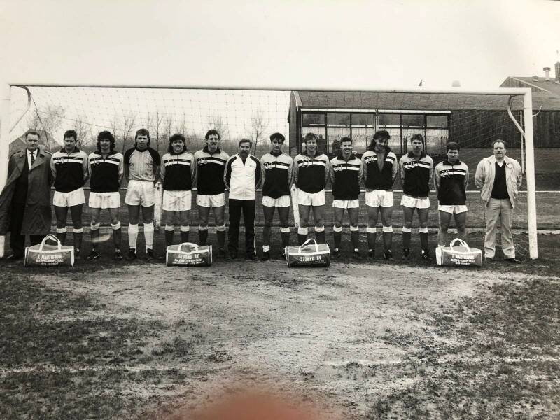 Vlnr : Trainer Cor Verhoeven, Wim Stok, Harrie v.d. Stoep, Marco Weggemans, Ben Brandhof, Peter de Jong, Boudewijn Steur (grensrechter), Mohammed Bachau, Ad Verhoeven, Carlo Peverelli, Robert Nicodem, Nico Bazen, Joep de Raad en leider Jan v.d. Dussen. Op de 2e foto dezelfde spelers iets anders opgesteld.