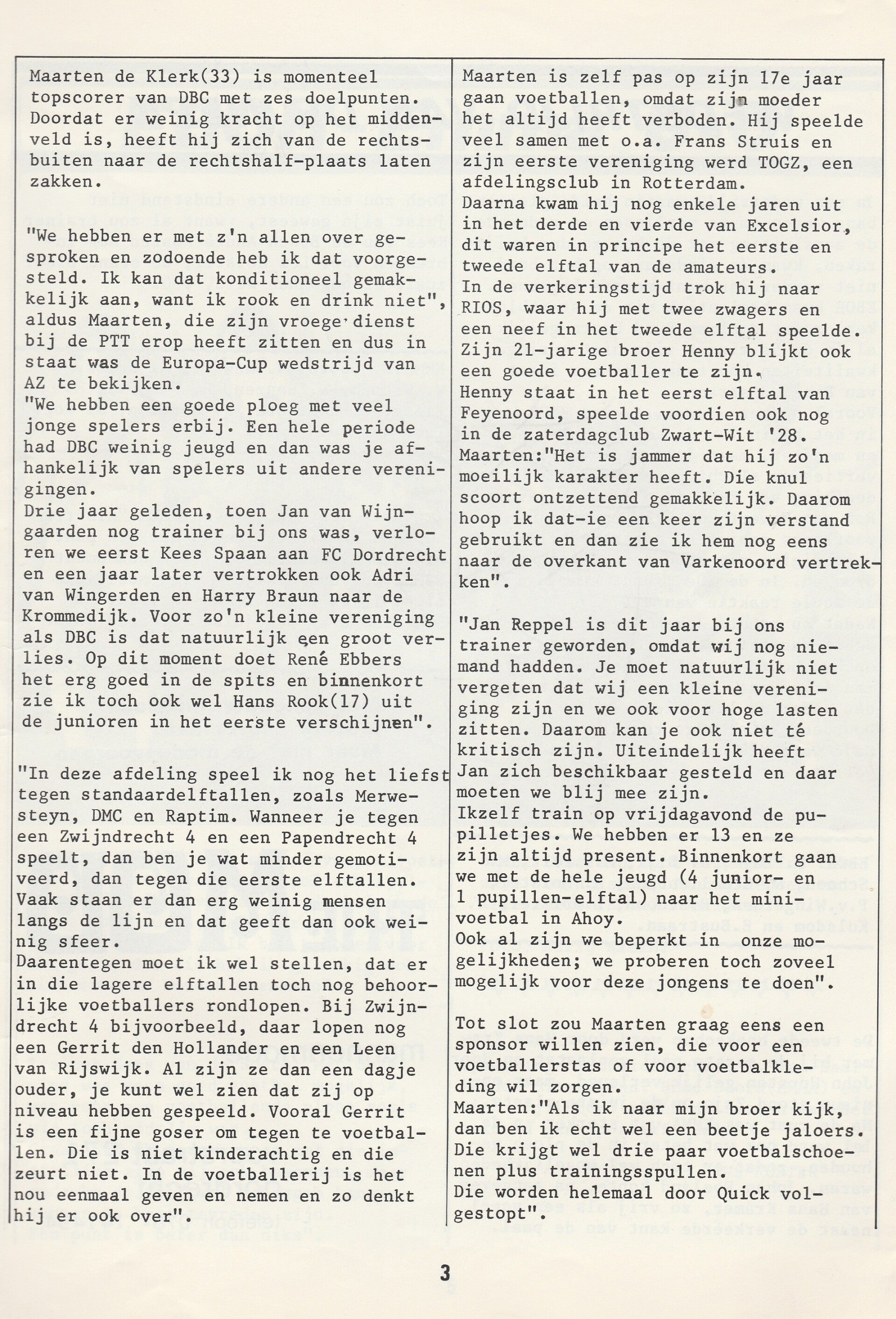 Wat pagina's uit Voetbal Dordrecht. Destijds een interessant weekblad. Maarten de Klerk persoonlijk gekend. Toen Zwijndrecht 2 in 1973 promoveerde werd er in de reseve 1e klasse tegen de 1e amaterus van een aantal betaalde clubs gespeeld als ADO 3, Feyenoord 3, Sparta 3 en Excelsior 3. Maarten speelde toen in Excelsior 3. dat waren altijd leuke potjes van goed niveau. Zwijndrecht 2 draaide dan ook goed mee. Later ging hij bij DBC in Dordrecht spelen. Ik heb dus met Zwd 2 en 4 bij Excelsior en DBC tegen hem hem gespeeld. Dat was in de 1e klasse van de Dordtse onderafdeling. Die Dordtse 1e elftallen konden maar zelden van ons winnen en dat werd ons zelden in dank afgenomen, lees hieronder pagina 3. Mooie tijden waren dat.