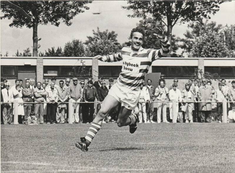 Jan' s karakteristieke houding na een gemaakt doelpunt. Tekst achter op foto : Zwijndrecht-Pelikaan 6-1