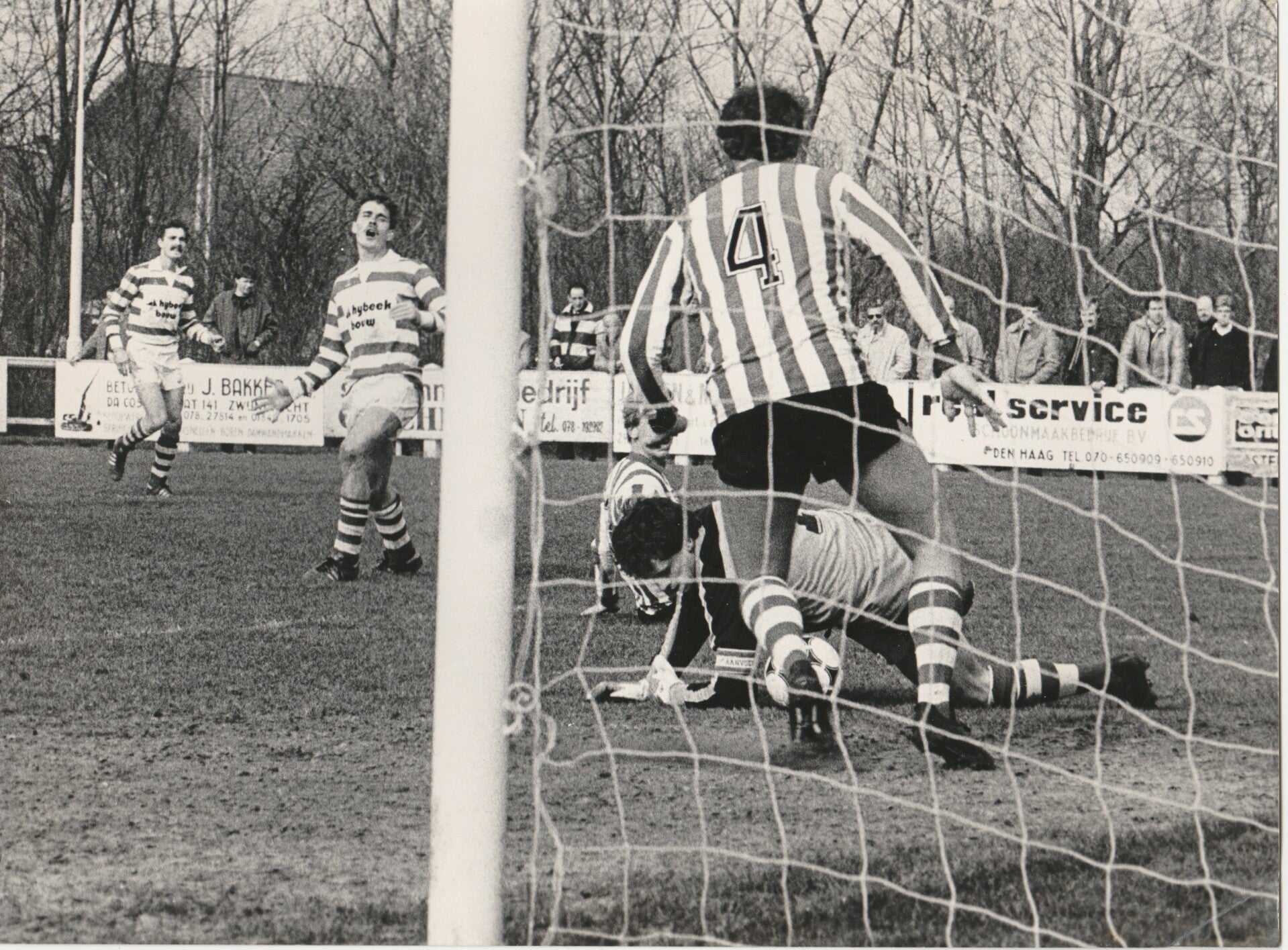 Fotomoment uit de wedstrijd Zwijndrecht-Sparta 18 maart 1984. Jan Kroos kijkt jammerlijk toe hoe de bal onder de keeper smoort en niet over de doellijn gaat. Leen kijkt al wantrouwend toe.