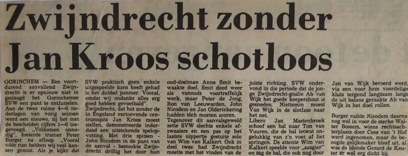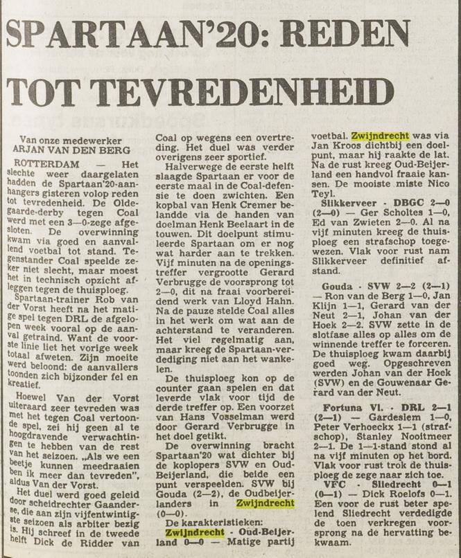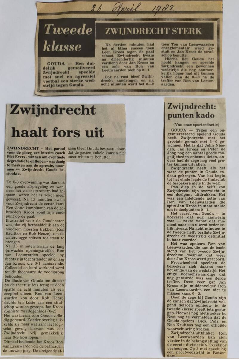 Verslagen Zwijndrecht-SVW per 18-04-1982 en de stand. Voor Zwijndrecht allerminst al een gelopen koers met nog 7 wedstrijden te gaan.