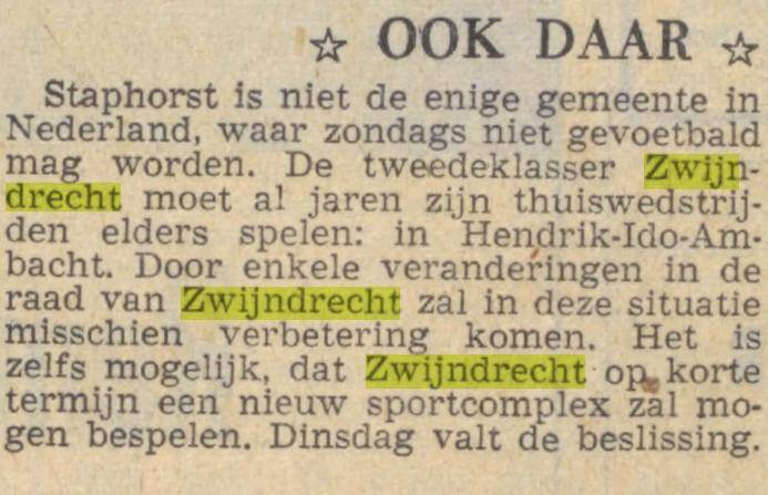 Tijdens het seizoen 1963/1964 kwamen tijdens het ophalen van de statistieken ook ondervemelde artikelen boven water. In streng gereformeerde of Christelijke gemeenten, waar Zwijndrecht dus ook bijhoorde, was voetbal op zondag uit den boze. De oudjes onder ons weten het allemaal. Voor 1965 werd het voetbalspel gespeeld buiten de Gemeentegrenzen van Zwijndrecht. Eigenlijk te minderwaardig voor woorden, dat dat toen kon. Het seizoen 1964/1965 ging vv Zwijndrecht domicilie houden op de BovenNoord. Uiteindelijk werd het Sportpark Bakestein in 1968 gerealiseerd en kreeg het zondagvoetbal zodoende toch een plekje.