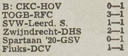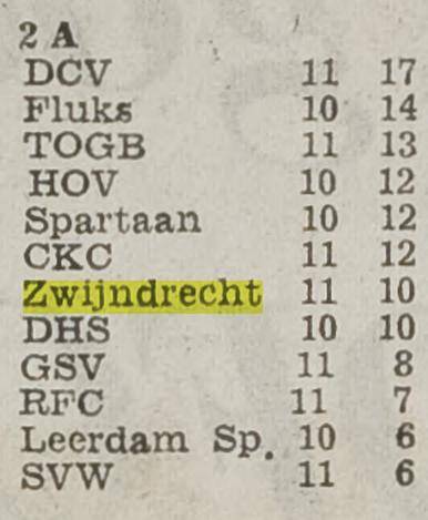 TOGB won zijn laatste en eerder afgelaste wedstrijd tegen HOV. Om de 2e degradant te bepalen moest er tussen GSC en SVW een beslissingswedstrijd gespeeld worden, die door SVW gewonnen werd. Zwijndrecht bleek een stabiele middenmoter. Piet de Wit, Henk de Visser en Cees v.d. Berg lieten van zich spreken.